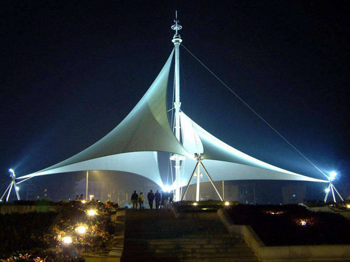 景觀膜結構又稱張拉膜景觀,主要通過膜結構的張拉式 呈現出唯美的結構特征;膜材料是指聚酯纖維基布或PVDF、PVF、PTFE等不同的表面涂層,配以優質的PVC組成的具有穩定的形態,并可承受一定載荷的建筑紡織品。它的壽命因不同的表面涂層而異,一般可達成10-20年;其外觀整潔大方,自潔性強。主要應用于各大公園,世博園,和一些廣場,商場等場所。