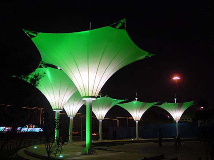 景觀膜結構又稱張拉膜景觀,主要通過膜結構的張拉式 呈現出唯美的結構特征;膜材料是指聚酯纖維基布或PVDF、PVF、PTFE等不同的表面涂層,配以優質的PVC組成的具有穩定的形態,并可承受一定載荷的建筑紡織品。它的壽命因不同的表面涂層而異,一般可達成10-20年;其外觀整潔大方,自潔性強。主要應用于各大公園,世博園,和一些廣場,商場等場所。